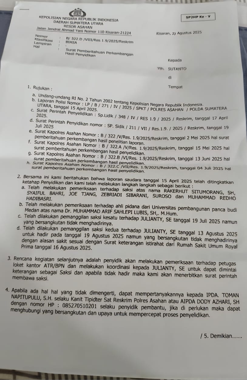 Tindakan penjemputan paksa oleh penyidik terhadap Julianty diketahui berdasarkan dari surat pemberitahuan perkembangan hasil penyidikan (SP2HP) Nomor : B/322.D/VIII/Res.1.9/2025/Reskrim yang telah diterima korban Sutanto dari Polres Asahan.