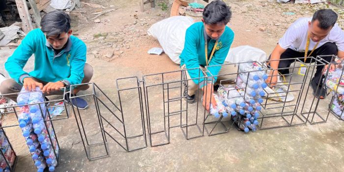 Setelah sampah plastik kering, potong menjadi bagian kecil menggunakan gunting. Masukkan potongan sampah plastik tersebut ke dalam botol plastik. Gunakan tongkat kayu atau bambu yang telah disediakan untuk mendorong dan memadatkan isian.