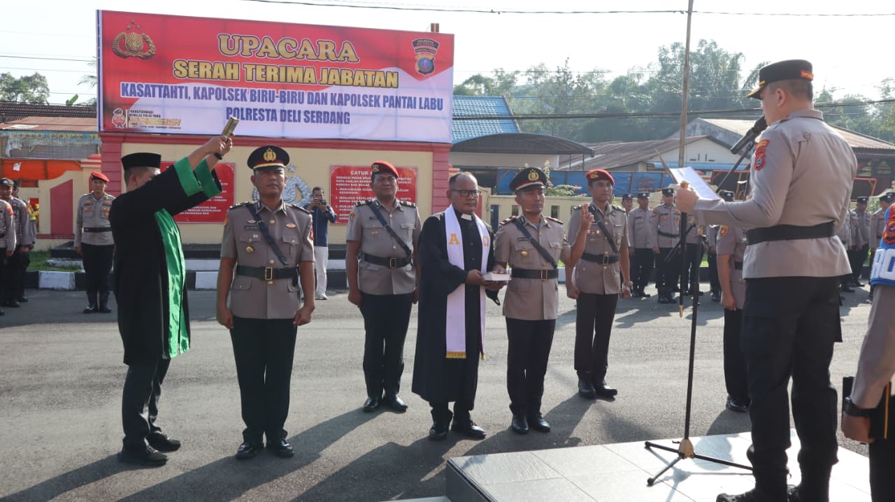 Serah terima jabatan tersebut meliputi tiga posisi strategis, yakni Kasat tahti, Kapolsek Biru-Biru dan Kapolsek Pantai Labu.