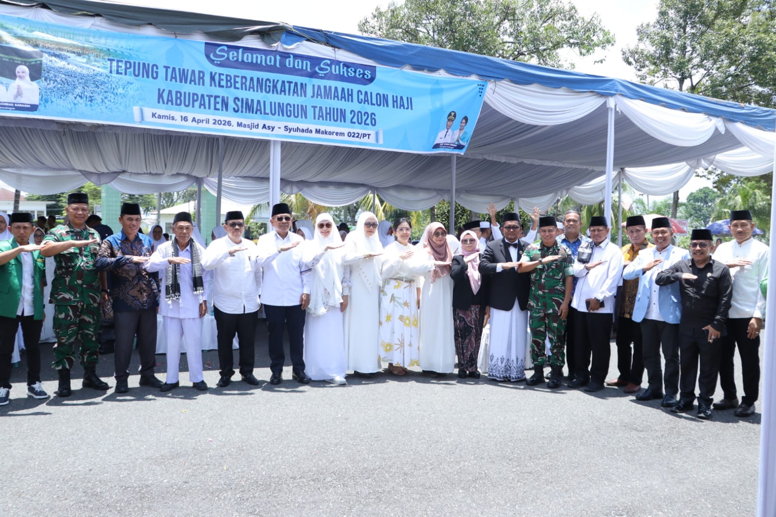 SIMALUNGUN (medanbicara.com) – Suasana penuh khidmat menyelimuti halaman Masjid Asy Syuhada Korem 022/PT, Jalan Asahan, Kecamatan Siantar, Kamis (16/04/2026). Pemerintah Kabupaten (Pemkab) Simalungun menggelar acara tepung tawar kepada 104 jamaah calon haji (calhaj) musim haji 1447 H/2026 M.